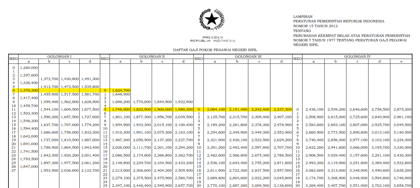 - Peraturan Pemerintah Republik Indonesia Nomor 15 Tahun 2012 Tentang Perubahan Keempat Belas Atas Peraturan Pemerintah Nomor 7 Tahun 1977 Tentang Peraturan Gaji Pegawai Negeri Sipil. ~ unduh