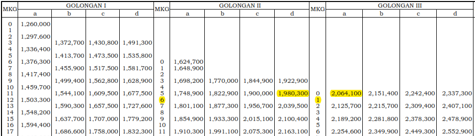 Teman saya Mr. J sebelum kenaikan pangkat terakhir berada pada golongan II.d, MKG 9 tahun 0 bulan dan gaji pokok Rp. 2.100.400,-. Ketika Mr. J naik pangkat ke golongan III.a, maka MKG-nya setelah diperhitungkan menurut daftar gaji pokok PNS menjadi 4 tahun 0 bulan (berkurang 5 tahun) dengan gaji pokok Rp. 2.189.200,-
