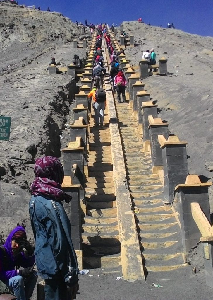 Tujuan utama kami berikutnya adalah kawah Bromo itu sendiri. Jeep berhenti di area parkir, dan dari sana kami harus melanjutkan dengan berjalan kaki. Bagi yang tidak kuat, tersedia kuda sewaan. Tapi saya memilih berjalan. Saya ingin merasakan betul bagaimana rasanya menapaki anak tangga menuju bibir kawah legendaris itu. Awalnya semangat saya membuncah. Tapi begitu mulai menapaki tangga demi tangga, nafas mulai ngos-ngosan. Entah berapa kali saya berhenti, memegangi lutut, atau pura-pura melihat ke belakang hanya untuk mencari alasan beristirahat. Ternyata semangat saja tidak cukup, fisik juga harus ikut kuat.